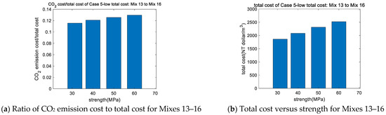 - Case 4 (low-total-cost concrete with carbonation) revealed similar results for Mixes 13–16 to those for Mixes 9–12, respectively, as the cost of CO2 emissions (12% of total cost) was substantially less than the material cost and, thus, did not influence the outcome.