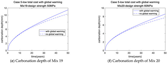 According to the genetic algorithm, the optimal mixtures were determined, as presented in Table 13. The performance of these optimal mixtures for Case 5 is shown in Table 14. The design strength of Mix 17 was 30 MPa; however, its actual strength was 33.44 MPa, as carbonation durability dominated the mixture design to a greater extent than Mix 13 due to global warming. To address carbonation with global warming, a greater binder content and greater strength ought to be used. The results for Mixes 18–20 overlapped with those for Mixes 14–16, respectively, suggesting no influence of global warming. The superior binder content of these mixes led to increased resistance to carbonation even in the face of global warming. Figure 7 shows that, as the strength of concrete increased, the total cost of concrete increased (Figure 7a), whereas the water/binder ratio (Figure 7b) and carbonation depth decreased (Figure 7c–f). Furthermore, the case study results show that the carbonation depth of concrete under global warming was substantially greater than that without global warming, especially toward the end of service life (Figure 7c–f).