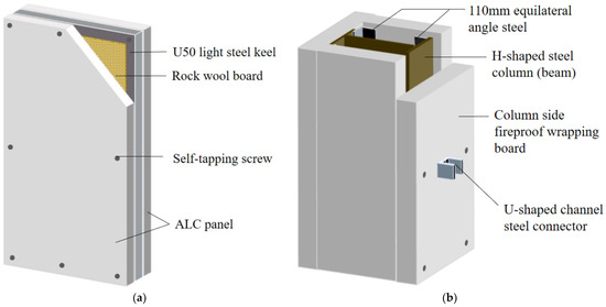 The proposed enclosure system is highly modular and well suited for prefabricated buildings. ALC was selected as the material for the sandwich wall panel, as shown in Figure 1a. The ALC panels were used as a fireproof cover for the steel beams and steel columns to create an integrated enclosure system. All panels in the system were connected by novel connectors to meet the standard and enclose the system, as shown in Figure 1b. The wall panel has high aesthetic value and is fire resistant and easy to install [27,28].