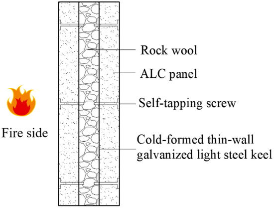 The installation process of the integrated enclosure wall panel proceeds from top to bottom, and the size of the wall panel can be adapted to the size of the building. The construction is quick and simple. We used two types of wall panels in the fire resistance test (Table 1). The ALC sandwich wall panel was denoted as A, and the quantity is two (named A1, A2).