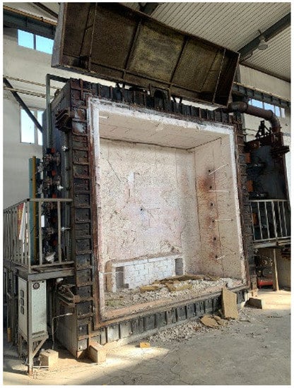 The fire-resistant test furnace at the Liaoning Provincial Product Quality Supervision and Inspection Institute was used in the experiment. The test device is shown in Figure 6. The heating curve based on the international standard ISO-834 [29] was used in the simulation to measure the temperature of the wall panels, beams, and columns. Only one side of the structure was exposed to fire, and the test was conducted at room temperature without loading. The standard heating curve is defined as follows: