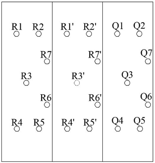 A fire resistance test of the sandwich wall panel was carried out. The fire resistance test lasted 1 h. The layout of the temperature measuring points of sandwich wall panels A and B is shown in Figure 7.