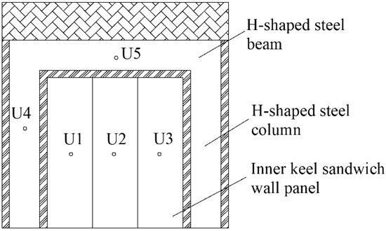 In test N(2), the temperature shows a similar rising trend at U1, U2, and U3 on the wall panel. The temperatures at the points of the H-shaped steel column showed a slow upward trend because point U4 is located in the middle of the H-shaped steel column and far away from the fire source in the furnace. Therefore, the temperature did not increase as fast as that of the H-shaped steel beam temperature. However, the temperature at U5 of the H-shaped steel beam rose at a uniform speed. The reason for this phenomenon is the uneven temperature distribution in the furnace, which causes a higher temperature in the middle part of the upper layer of the structure than in other parts.