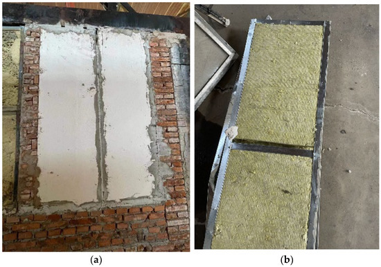 Since gypsum is a flame-retardant material that is lightweight and has low cost, a sandwich wall panel composed of gypsum boards was fabricated and denoted as B. This sandwich wall panel consisted of two 12 mm thick paper-faced gypsum boards with a center of U75 light steel keel and a 75 mm thick rock wool insulation layer. The length and width of panels A and B were the same. The on-site assembly of the sandwich wall panels is shown in Figure 3.