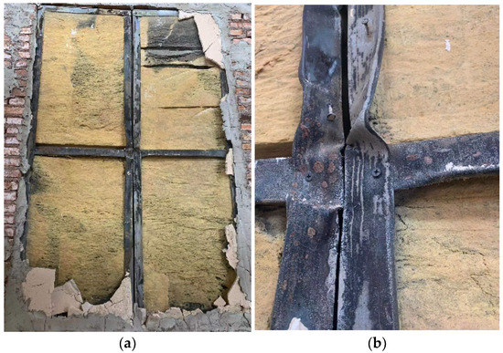 (1) The fire surface of the ALC panel (panel A) and its parts after the test are shown in Figure 10a. It was observed that the internal keel frame and rock wool of the sandwich wall panel had not changed significantly, and the light steel keel frame was not deformed (the deformation of the steel keel in Figure 10b is caused by disassembly after the test). The rock wool board in the wall panel was not carbonized, and the self-tapping screws connecting the light steel keel and the ALC wall panel were not deformed.