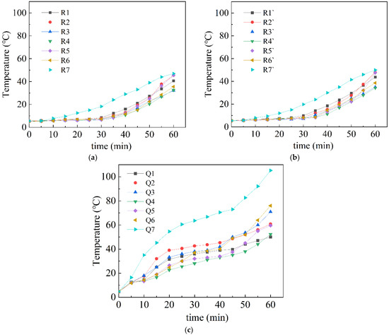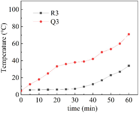 The temperature is affected by the position of the flame nozzle of the test furnace and the distance between the components and the fire center. It is challenging to achieve uniform heating. Therefore, the temperature measurement points R3 and Q3 at the center of the test wall panel were selected for analysis; the temperature curves of these points are shown in Figure 13.