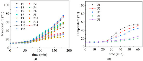 The T-t curves of tests N(1) and N(2) are shown in Figure 14. In test N(1), the duration of exposure to the fire is 3 h. The column was protected by the ALC plate on the fire surface in the first 50 min of the test, and the temperature remained unchanged. After 50 min, the rate of increase at the measuring point under the column is lower than that of the upper measuring point, which is caused by the high temperature in the upper part of the furnace, but the temperature difference is very small. After the test, the average temperature of the measuring points at the position of the steel column was 42.9 °C, and the average temperature of the measuring points at the position of the steel beam was 65.8 °C. The highest temperature occurs at P15, which is located in the upper part of the right flange of the H-shaped beam, as shown in Figure 14a. Therefore, the 100 mm thick ALC panel exhibited good fire resistance and protected the steel beams and steel columns.