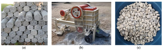 (a) Concrete waste cylinders, (b) crushing machine, and (c) RCA obtained from concrete waste cylinders.