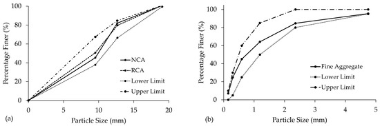 The NCA and RCA used in this study had a maximum size of approximately 19 mm, which is the typical maximum size used in concrete for structural elements in Thailand. Figure 1c shows the RCA used in this study. The specific gravity and water absorption of the RCA were 2.43 and 4.59%, respectively, while the corresponding values of NCA were 2.7 and 0.28%. Sieve analysis of coarse and fine aggregates was conducted in accordance with ASTM C136 [48], and the corresponding results are shown in Figure 2. The properties of coarse and fine aggregates are summarized in Table 1.
