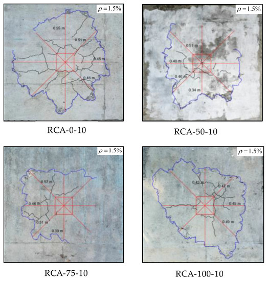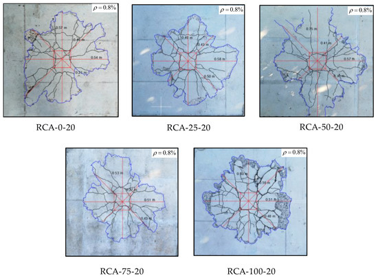 For the slab series with a 0.8% reinforcement ratio (Figure 6), the large crack area had an average radius of approximately 500 mm from the center of the column stub. Cracks propagated from the center under the columns through the edges of slabs. The largest crack widths (that measure more than 1 mm) were observed in these slabs. The punching shear failure patterns for RAC slabs were similar to those of NAC slabs.