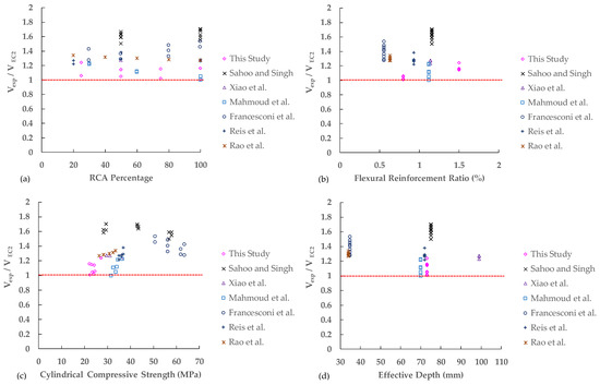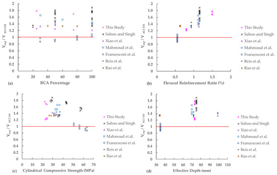 The first parameter that could have affected punching shear capacity is the content of RCA. Based on test results from Rao et al. [40], Mahmoud et al. [43], Xiao et al. [44], and this study, it was found that the ultimate punching shear capacity reduced with increasing replacement levels of RCA. These results contradict the findings by Reis et al. [41], Francesconi et al. [42], and Sahoo and Singh [45], where the punching shear strength was insensitive to RCA replacement levels.