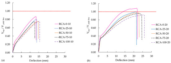 The ratios of experimental shear and yield-line load were used to confirm failure modes of the tested slabs. As the yield-line load is the predicted flexural capacity of the slab, the Vexp/Vyield-line was less than 1, thus confirming punching shear failures of the slabs. In this study, the shear ratios were below 1 for slabs with ρ = 1.5%, thus indicating that slabs in this series failed in punching shear mode. For slabs with ρ = 0.8%, the controlled slab without RCA (RCA-0-20) had Vexp/Vyield-line of 1.09, thus indicating flexural failure just before punching shear occurred. Other RAC slabs with ρ = 0.8% had Vexp/Vyield-line ratios just below 1, thus suggesting a punching shear failure before a flexural failure.