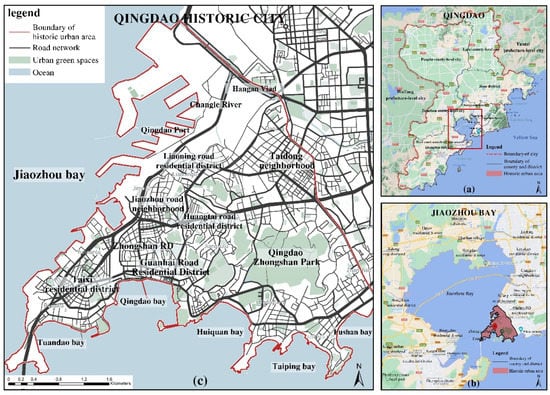 Study area. (a) Qingdao city area. (b) Location of Qingdao Historic City in Jiaozhou Bay. (c) Scope of Qingdao historic city.