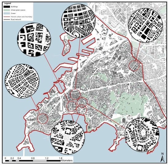 The result of mapping Jane Jacobs’ urban vitality criteria in Qingdao historic city is presented in different maps in Figure 4, Figure 5, Figure 6, Figure 7, Figure 8, Figure 9 and Figure 10. Comments on the side are made for each of the urban vitality conditions as well as for the final result in order to support their spatial interpretation.
