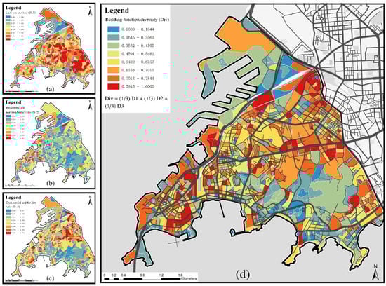The spatial distribution of function diversity corresponding scores in Qingdao historic city is presented in Figure 4. Figure 4a–c show the spatial distribution of land use mixture (D1), residential and non-residential ratio (D2), and commercial and facility ratio (D3), respectively. The high values of D1 are mainly located in the central–eastern part of the country, with relatively low diversity in coastal land use, while D2 shows the opposite distribution pattern, with a relatively high ratio of residential to employment in the coastal zone. Figure 4d shows the weighted superposition of the three indicators using the entropy weighting method to obtain the composite index of Div.