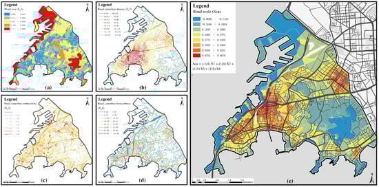 Road scale analysis. (a) Block size. (b) Road centerline density. (c) Road centerline connectivity. (d) Road centerline betweenness. (e) Road scale composite index.