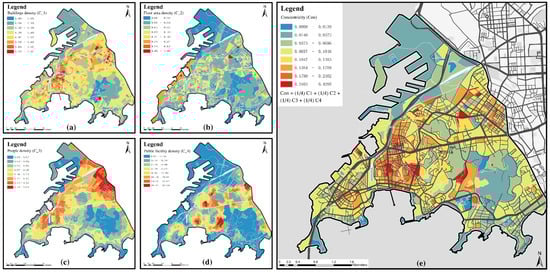 Connectivity analysis. (a) Buildings density. (b) Floor area density. (c) People density. (d) Public facility density. (e) Concentration composite index.