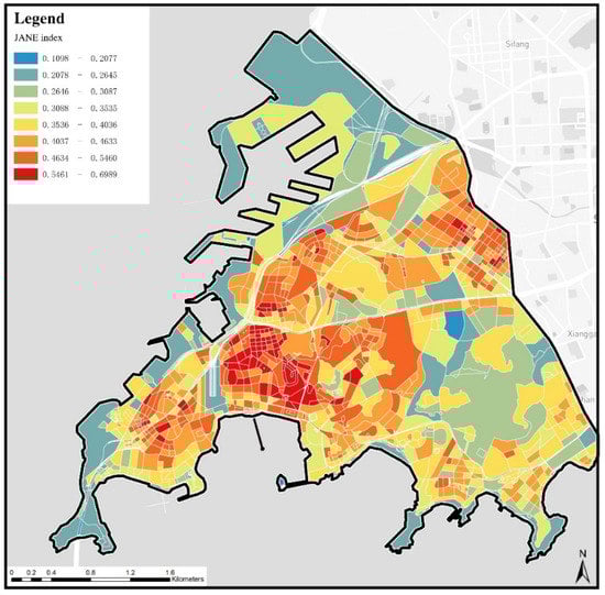In order to combine the 16 constituent indexes with the corresponding urban vitality criteria, we weighted them by applying the raw z-values. Among the six dimension indicators, Jacobs regards the first four as the primary conditions for the generation of urban vitality. She believes that these four conditions must work together to generate urban vitality, and that the absence of any one of them will prevent the generation of vitality, so we use equal weights for the first 4 indicators. The last two conditions are considered as secondary conditions that are more independent of each other, but they also play an important role. In this paper, we adopt a more direct idea of weight assignment, i.e., 2:2:2:2:1:1, which is a simpler and more direct expression of Jacobs’ criterion. The JANE index of urban vitality after overlay analysis is constructed as shown in (16).