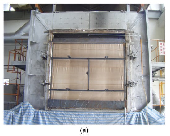We investigated the heat and smoke resistance performance of the non-heat-resistant fire retardant curtain incorporating a water film using full-scale door/wall refractory furnace and smoke-barrier tests (Figure 1a). The furnace test provided data on the standard temperature heating curve for heat resistance. The construction and function of the furnace complied with ISO 834-1 [16], CNS 14803 [17], and ISO 3008 [18] for fire tests of fireproof doors (wood doors, steel roller shutters, etc.). The inner and outer dimensions of the furnace were 430 (W) × 450 (H) × 100 (L) cm and 500 (W) × 520 (H) × l40 (L) cm, respectively. The dimensions of the available testing area, hereto referred to as the area directly exposed to the furnace fire, were 400 (W) × 400 (H) cm; the maximum testing duration was four hours.