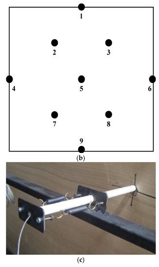 Thermocouples on the unexposed surface of the curtain: (a) installed on the testing frame, (b) positions of the thermocouples, (c) fixed with a spring device.