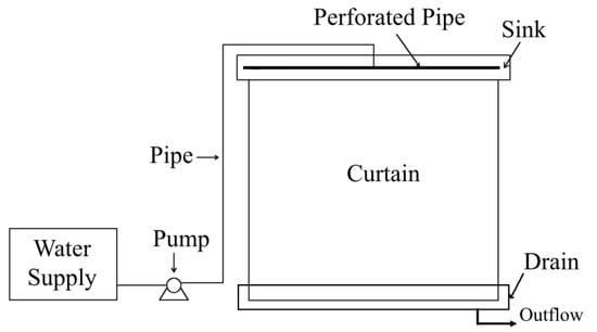 Figure 3 shows a schematic representation of our water film system using a hydraulic pump, steel pipe, and a piping system. The resultant water film aims to cover the non-exposed-to-fire surface of the curtain. Previously published test results demonstrated a perforated pipe that allowed water to exit through small holes along the length of the pipe to form a water film that covered the unexposed surface of the curtain [19,20]. In accordance with the calculation results [21], the first 28 holes from the end hole were 4 mm in diameter and the others were 4.1 mm. We placed the water inlet in the middle of the perforated pipe so that the jet velocity difference between the water inlet and the end hole was reduced. To match the specified flow rate, we also used a Grundfos single-phase 220 V–2210 W pump with a maximum head and flow rate of 52 m and 166 L/min, respectively. The relationship between the total water flow rate and uniformity of water film before the fire test is shown in Table 2. This result indicates that the minimum water flow rate needed to form a uniform water film is about 110 L/min (12.3 L/min/m2).