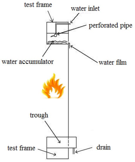 We also conducted an unexposed surface fire test (Figure 4). An accumulator was included to produce a consistent thickness of the water film horizontally across the width of the test curtain. A trough was installed at the bottom of the curtain to collect the remaining water from the curtain surface to investigate the relation between the evaporation of the water film and the heating rate of the furnace during the fire test. The volumetric flow rate of the return water was measured by a calibrated container of 100 L capacity.