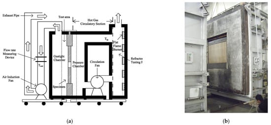 In the fire tests, the objective of the heating duration was 90 min. Tests of the fire-proof curtain were conducted with and without water film in contrast. The operating pressure on the perforated tube, Pop, was set to 196 kPa to maintain a constant depth in the accumulator so that a uniform film depth could be maintained over the curtain before the testing. The total flow rate was 111 L/min (12.3 L/min/m2), the velocity of the water film vs was 30.3 cm/s, and the average thickness of the water film was 1.27 mm. All of the data signals were collected and converted using a data acquisition system (Yokogawa DA100). The data acquisition system then transmitted the converted signals through a DAQ interface to a personal computer for further operation. Additionally, a smoke-barrier system was used to investigate the smoke resistance of a curtain with a water film system in this study, as shown in Figure 5a. It consisted of a refractory wall/door testing furnace and a smoke-barrier testing device (Figure 5b). This smoke-barrier system could be used to simulate and examine the smoke behavior through openings (vents or holes), doors, and shutter assemblies in a building fire.