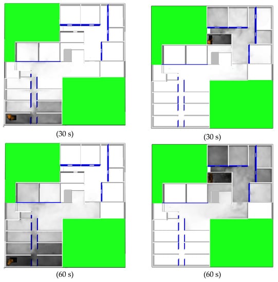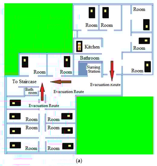 The simulation results for the selected nursing home with only a detector and sprinkler set are shown in Figure 13. Figure 13a shows the current fire evacuation directions for the nursing home. Each floor of the nursing home only had one escape exit, connecting straight to the stairs for evacuation and escape. This research assumed that the doors of all of the rooms were open, so 30 s after the fire at the fire point above a bedside started burning, thick smoke diffused into three rooms. Thick smoke spread to the middle aisle after approximately 60 s. After 120 s, the thick smoke spread to the rooms in another zone. When a fire occurred at a fire point in the kitchen, thick smoke diffused into four rooms after burning for 30 s. After 60 s, thick smoke spread to the middle of the aisle. After 120 s, the thick smoke spread to the escape exit. According to these results, when the fire is burning, the smoke diffusion area is directly proportional to the burning time. If a fire is not immediately detected and extinguished in the initial stage, then the smoke diffusion speed will shorten the escape time for disadvantaged evacuees in a nursing home. When other fire-fighting measures are not taken, there will be even greater casualties.