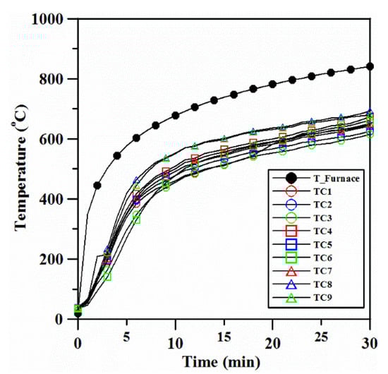 Figure 7 shows the temperature variation of each thermocouple on the unexposed surface of the curtain and the average temperature inside the furnace during the fire test. Our results show that the fireproof curtain was uniformly heated, as there was limited temperature variation. The average fireproof curtain could bear up against fire and flame, but in the absence of a water film system, the surface temperature increased as fire continued to burn. The temperature on the unexposed surface basically followed the furnace temperature with a difference around 200 °C. The LPG fuel consumption in this 30 min fire test was 10.86 L. Thus, a typical fireproof curtain is prone to heat-induced degradation, which led to the breakdown of the curtain occurring at 30 min after ignition (as shown in Figure 8). Our outcome demonstrated that fireproof curtains without a water film system only had fire integrity up to 30 min; heat resistance was approximately five minutes.