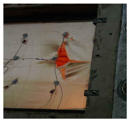 We installed a 300 × 300 cm curtain, with a thickness of 0.8 mm, on a testing frame (shown in Figure 2a). Figure 2b displays the distribution of thermocouples on the unexposed surface of the curtain. The fire retardant curtain specimens could experience pressure changes inside the furnace during the experiments, which would cause shaking of the curtain surface. For stabilization, spring devices were installed to secure the thermocouples with the curtain (Figure 2c).
