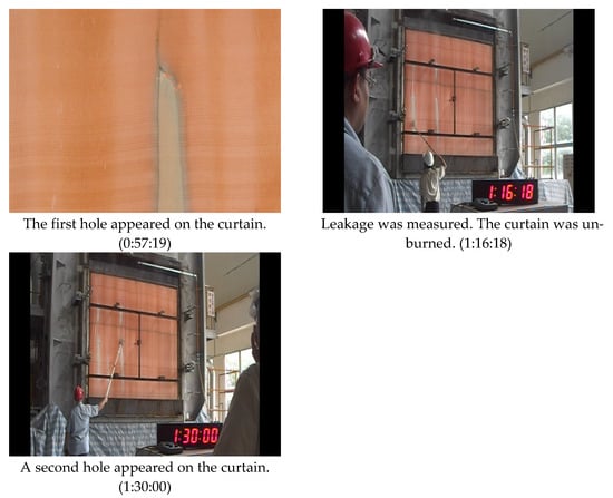 The experimental record is summarized in Table 3. Each experimental stage and photos of important observations are shown in Figure 9. As illustrated, the amount of water film being heated into water vapor during the experiment was minimal; the amount of water supplied in this experiment was sufficient to form a water film on the curtain’s surface. Since the surface was uneven, water films generated dry zones on the curtain, which ultimately led to the generation of hot spots. After the hot spots had been continuously heated, a burnt hole appeared at 57 min. Another hot spot zone and burnt hole appeared after 90 min into the experiment. However, direct fire transference was not observed when a standard cotton cloth was placed in the burnt holes, indicating that the curtain still had heat-resistant properties. The LPG fuel consumption at 30 and 90 min during the fire testing of the fire retardant curtain with a water film system was 15.56 and 56.28 L, respectively. Because the water film on the unexposed surface of the curtain could absorb some of the heat in the furnace, the LPG fuel consumption in a case of fire testing of the fire retardant curtain with a water film system was much greater than that without a water film system.