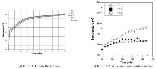 Figure 10a–d shows the heating curves for all points inside the wall/door furnace. The experimental results showed that all of the temperatures were within the heating curve range specified in CNS 14803 [17]; however, the heating rates at each position were not consistent, so the heating on the curtain was uneven. The combustion and pressurization processes in the furnace expanded and bent the curtain externally.