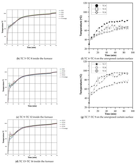 Temperature curves of the measurement points; (a) 1–4, (b) 5–8, (c) 9–12, and (d) 13–16 inside the wall/door furnaces; (e) 1–3, (f) 4–6, (g) 7–9 on the unexposed curtain surface.