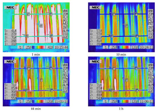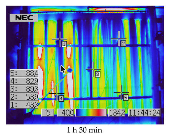 Figure 11 shows a plot of the temperature distribution on the curtain surface measured using an infrared thermal imager. The measurement points 1–5 denoted in the infrared thermal imager correspond to the measurement points 2, 3, 5, 7, and 8 of the thermocouples. As demonstrated, the right-side temperatures of the curtain were lower because of the non-uniformly formed fire retardant surface on the curtain. However, after the experiment had continued for 90 min, the temperature difference on the thermal imager was not great, suggesting that the temperature change in the curtain tended to be stable, while the dry zone gradually expanded over time. For the duration of the experiment (90 min), apart from the two hot spots that began to appear on the left side of the curtain at 44 min, the surface temperatures were all less than 150 °C. For the remaining zones covered by the water film, the surface temperatures of the curtain were all below 100 °C.