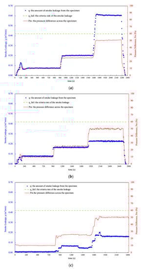 Figure 12 shows the smoke control performances of (a) the fire retardant curtain without a water film system at normal temperature; (b) the fire retardant curtain with a water film system at normal temperature; and (c) the fire retardant curtain with the water film system at 200 °C. In Figure 12, q represents the amount of smoke leakage from the specimen, q_fail is the criteria rate of the leakage of ambient (cold) and medium (warm) temperature smoke from one side of the specimen to the outside. At normal temperatures, the smoke control performances of the fire retardant curtain were 0.08 m3/min (10 Pa), 0.18 m3/min (25 Pa), and 0.56 m3/min (50 Pa). At 50 Pa, the smoke control performance of the fire retardant curtain (0.56 m3/min) exceeded the standard value (q_fail) of 0.42 m3/min. The fire retardant curtain thus cannot meet the standards of ISO 5925-1 [22]. For the fire retardant curtain with the water film under normal temperature conditions, the smoke control performances were 0.08 m3/min (10 Pa), 0.17 m3/min (25 Pa), and 0.23 m3/min (50 Pa). At 200 °C, the smoke control performances of the fire retardant curtain with the water film system were 0.02 m3/min (10 Pa), 0.08 m3/min (25 Pa), and 0.16 m3/min (50 Pa). Therefore, when the water film system was applied in the curtain, the smoke control performance was enhanced and under normal and intermediate temperature conditions, it could meet the standards of ISO 5925-1 [22].