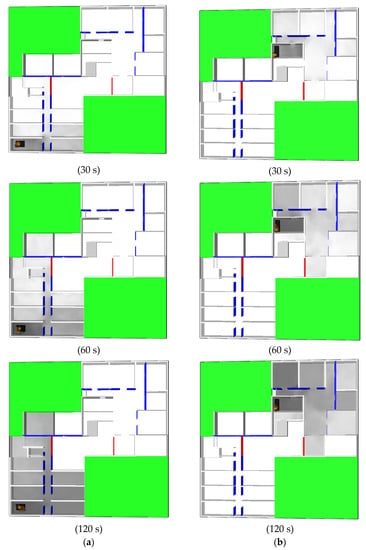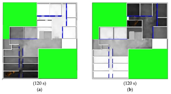 Smoke spread simulation for a temporary evacuation relay station built with a fireproof curtain with the 1.5-h fire-resistance period: (a) fire point above a bedside, and (b) fire point in the kitchen.