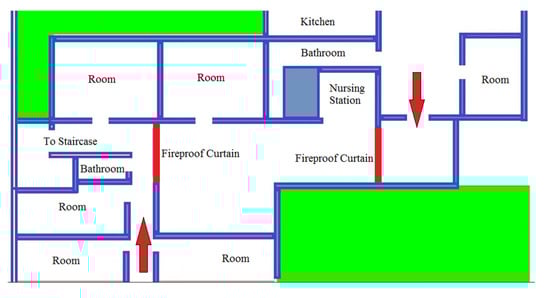 Some buildings now use fire resistant materials and smoke control components in order to establish fire safety compartments inside interior spaces. Based on the different performance-based designs of such compartment regions, these can be defined as fire compartments, smoke compartments, and refuge spaces [5]. A fire compartment is generally built with heat-resistant materials and designed to slow the burning rate and prevent a fire from entering a fully developed state. Smoke compartments are built with smoke control materials and prevent smoke or toxic gas leaking out when a fire occurs. Refuge spaces are based on a combination of fire and smoke compartments, and use materials with heat resistance and smoke control properties to keep the advantages of both compartments. To ensure the security of escape routes and convenience of operation, the openings of refuge safety compartments are always made of light materials that are easy to use, and thus objects such as fire retardant curtains have become a necessary part of nursing home design.
