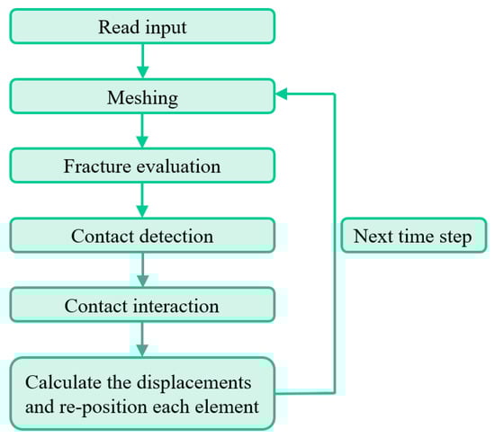 In this study, the behavior of historic masonry structures due to foundation differential settlement was simulated with the 2D FDEM program “Y” developed by Munjiza [41]. It was designed to demonstrate some concepts explained in [25]. In order to use the FDEM program “Y”, an input file describing the investigated structure needs to be prepared firstly. A flowchart is shown in Figure 1. Relevant data is updated in the database after each time step, and the database is accessible for the computation of next time step.