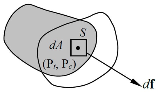 Contact forces are determined using the penalty function method [44]. Figure 2 shows two entities in contact in 2D with an overlapping area S. Penetration area dA yields the infinitesimal contact force df, as shown in Equation (2):