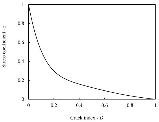 In Equation (7), c1 and c2 are constant parameters. For masonry structures, c1 = 3.0 and c2 = 6.93 were suggested by Zivaljic et al. [50]. Thus, the z–D curve is plotted in Figure 4, and the area beneath the curve is the Mode I strain energy release rate Gf, i.e.,