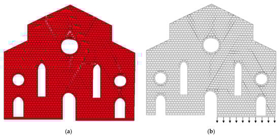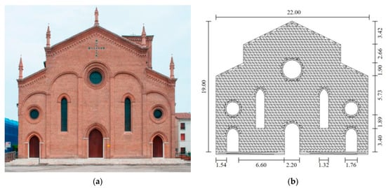 Gagliardo et al. [22] studied the response of a masonry façade in Nativita della Beata Vergine Maria church (see Figure 5a) in Bondeno, Italy under differential settlements using rigid block limit analysis. The church façade is 22.0 m wide and 19.0 m high, consisting of 1873 masonry blocks. The FDEM mesh is shown in Figure 5b. The right support is assumed to settle downwards at a velocity of 0.05 m/s, while the left support is fixed. In total, there are 3890 elements in the model, and the material parameters in FDEM analysis are given in Table 1 based on [22]. The friction coefficient is 0.6, and the time step is 5 × 10−7 s.
