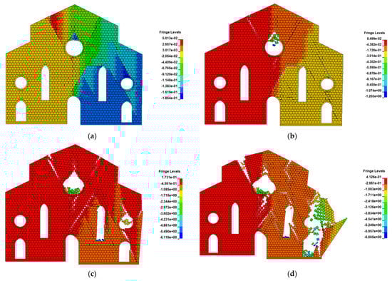 The collapse process of the church façade (in the contour of vertical displacement, unit: m): (a) d = 0.15 m; (b) d = 0.245 m; (c) d = 0.48 m; (d) d = 0.685 m.