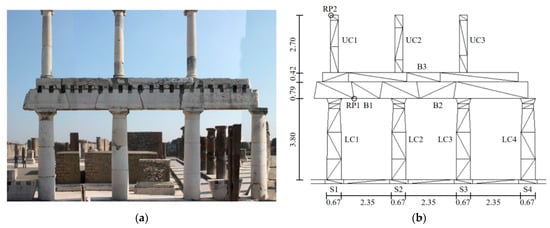 The remain structure of Forum in Pompeii (see Figure 8a), which is a group of two-story colonnades, is investigated. The geometry and the FDEM mesh are shown in Figure 8b. There are seven columns, denoted by UC1, UC2, UC3 in the top story and LC1, LC2, LC3, LC4 in the bottom story. Four supports are denoted by S1, S2, S3, and S4. Two reference points, i.e., RP1 and RP2, are selected for discussions. There are 94 elements in total, and the material properties are given in Table 2 according to [20]. Each lower column is placed above a movable support so that different differential settlement combinations can be simulated. The settling rate of supports is assumed to be 0.05 m/s. The friction coefficient is 0.6, and the time step is 5 × 10−7 s.