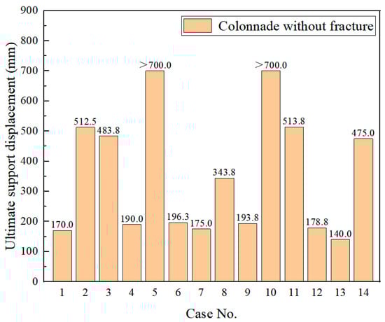 Several differential settlement scenarios are investigated: (1) one single support settles, (2) two supports settle simultaneously, and (3) three supports settle simultaneously. In total, there are 14 cases (see Table 3). Failure mode and the corresponding ultimate support displacement for each case are presented in Table 4 and Figure 9, respectively. The collapse of upper columns and the fall of blocks in epistyle are observed in most cases. Cases 1, 7, and 13 are the most critical cases in their own category, and the corresponding ultimate support settlements are 170.0 mm, 175.0 mm, and 140.0 mm, respectively. Among the 14 cases, Case 13 exhibits the lowest ultimate support displacement, i.e., the colonnade structure has the lowest capability against differential settlement. For Cases 5 and 10, the colonnade structure did not collapse at the end of the simulation, i.e., the ultimate settlement is larger than 700 mm.