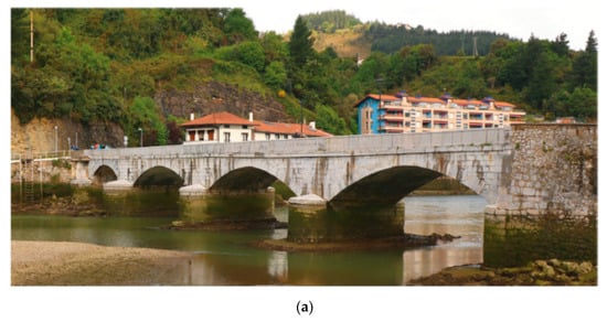 Deba arch bridge: (a) site view [17] and (b) geometry (unit: m) and FDEM mesh.