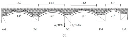 Experimentation is a direct way of studying the responses of masonry structures by differential settlement. Giardina et al. [11] performed a 1/20 scaled model test on a stone masonry façade to evaluate its failure mechanism subjected to differential settlement. Portioli and Cascini [12] investigated the collapse of rectangular masonry walls under foundation differential settlement experimentally and identified the locking failure mode. Romano and Ochsendorf [13] studied and compared the mechanical behavior of various Gothic masonry arches under differential settlement through experiments, and the obtained results showed that pointed arches could withstand larger support displacement than circular arches.