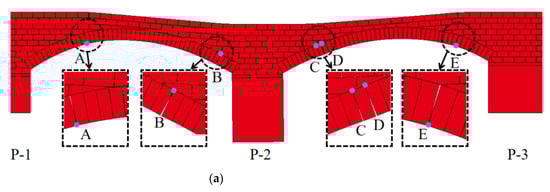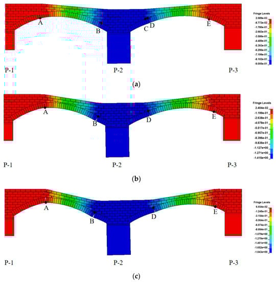 Figure 11 presents the FDEM simulation result against that from the geometrical survey [17]. After pier P-2 settled with δ1 = 0.90 m and δ2 = 0.86 m, five hinges (i.e., A, B, C, D, and E) were found in the masonry arch bridge. Some differences are still observed, since the actual structure and the differential settlement are complicated, and the FDEM simulation is performed in 2D, not in 3D. However, in spite of these differences, the FDEM simulation results are highly consistent with results from the geometrical survey [17], especially on hinges and their locations and the crack development. Thus, the FDEM is reliable in simulating the damage of masonry arch bridges under pier differential settlements. If P-2 settled further proportionally, the deformation of the arch bridge increased and the hinge positions changed. The vertical displacements of the bridge at different settlement stages are presented in Figure 12. It can be observed that the bricks separated clearly (Figure 12b,c), hinge A and B moved up towards the crown, similarly for hinge D. Hinge E moved downwards to pier P-3, and hinge C disappeared.