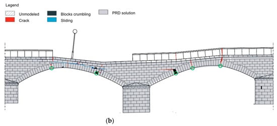 In this section, the Deba bridge is investigated as a monolithic bridge, and a new fine mesh with a characteristic size of 0.4 m is created (see Figure 16a). Material parameters about fracture are: tensile strength ft = 1.0 MPa, shear strength fs = 1.0 MPa, and the strain energy release rate Gf = 25.0 J/m2. Other material properties and the time step are kept as the same as in Section 3.3. In this case, δp = 8.0 × 10−6 m, δc = 1.0 × 10−4 m, sp = 8.0 × 10−6 m, and st = 1.0 × 10−3 m. Figure 16b shows the damage of the monolithic arch bridge under uneven settlement of P-2. Comparing Figure 11b and Figure 16b, the cracking paths and cracking locations are similar to each other. The ultimate pier settlement of the monolithic arch bridge is quite small (i.e., δ1 = 0.04 m, δ2 = 0.038 m), suggesting that non-fractured masonry arch bridge can withstand a much larger pier settlement since it can undergo a much larger deformation than the monolithic one. The differences between monolithic and masonry modeling strategies of a same structure have been captured by the FDEM.