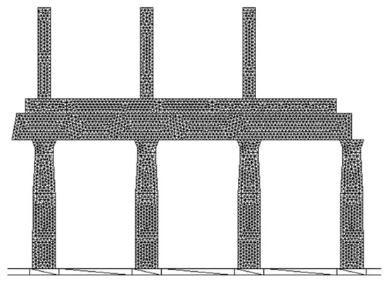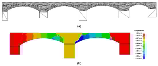 In Malena et al. [17], the damage of the Deba arch bridge in Spain (Figure 10a) due to a pier settlement was studied. The geometry and the FDEM mesh of the four-span masonry arch bridge are shown in Figure 10b, and an uneven settlement is applied to pier P-2 with δ1 = 0.90 m and δ2 = 0.86 m, while other piers and the abutments are kept intact. There are 1528 elements in total. Material properties are given in Table 5 based on [17], and the friction coefficient is 0.6. The time step is 2.5 × 10−7 s.