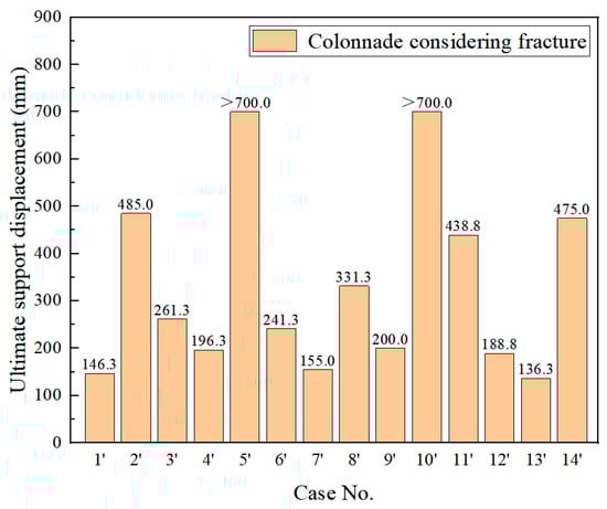 Similar to the case definitions in Table 3, the 14 cases are named as Case 1′, Case 2′, …, and Case 14′, respectively. Table 6 shows the failure of the colonnade structure subjected to the combinations of support differential settlement considering fracture, and the corresponding ultimate support displacement for each case are presented in Figure 14. In addition to the collapse of upper columns and the fall of blocks in epistyle observed in non-fracture cases in Section 3.2, fracture of blocks was identified. The most critical cases were still Case 1′, 7′, and 13′ in their respective categories. However, the corresponding ultimate support displacements were much smaller (i.e., 146.3 mm, 155.0 mm, and 136.3 mm, respectively), suggesting that fracture makes the colonnade more vulnerable to differential settlements. It may be explained that fracture makes multiple micro-cracks possible in masonry blocks, which reduce the stability of the entire colonnade structure to some extent. Among the 14 cases considering fracture, Case 13′ is still the most critical one with the lowest capacity against differential settlement.